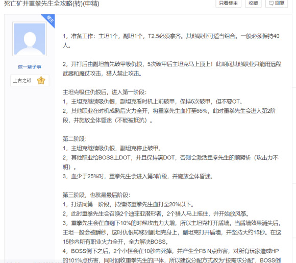 - 重拳先生在死亡矿井里是非常强力的boss,守在你挑战范里克夫的前面,他会使用多把武器攻击(死亡时也会掉落重拳先生的战斧、大锤,以及盗贼之刃三把武器),还会强制眩晕小队全体,新手不会玩的话可能会被团灭。因此也有人恶搞的模仿40人团本写了篇重拳先生的开荒攻略,贴在下面博君一笑。