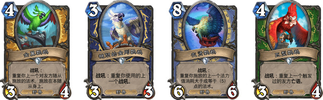 - 而炉石在死亡矿井迷你包,也推出了4种鹦鹉,其中金翼鹦鹉和艳丽的金刚鹦鹉迅速成为热度和胜率T0的高质量单卡,法师的灰贤鹦鹉也表现出色,只有巨型鹦鹉有些差强人意,总体来说这次鹦鹉的设计还是挺成功的。