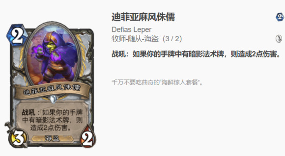 - 曲奇的拿手绝活是“惊人海鲜套餐” ,但他的卡牌说明告诉我们“没人喜欢惊人海鲜套餐。这个事实一点也不惊人”。牧师的新卡迪菲亚麻风侏儒也在用血淋淋的例子告诫我们。