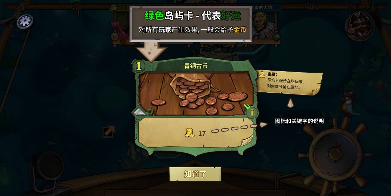 绿色岛屿一般是金币资源,选择对于自己分配有利的卡牌打出,除了自己打算打出的卡牌,还要去猜测其他人的游戏思路和策略。