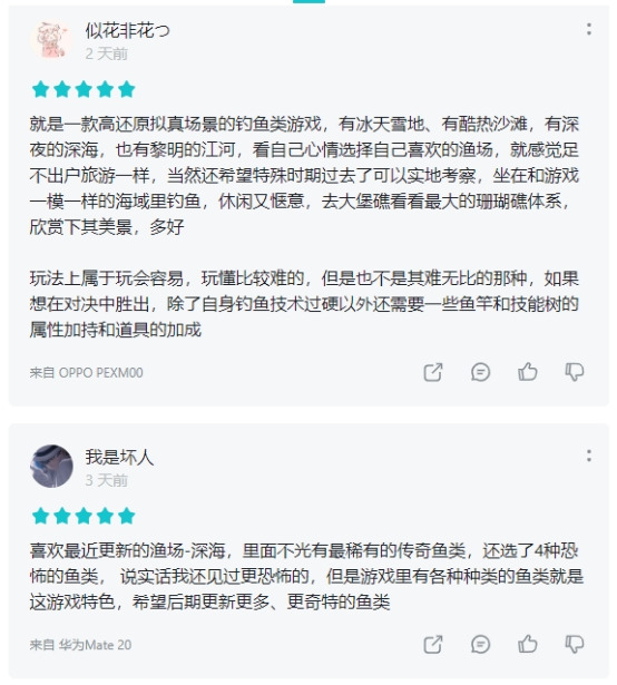 《钓鱼大对决》更新频率快、内容有趣缤纷,不但为所有钓友玩家们带来了足不出户即可畅享全球美景的绝佳体验,还凭借着各种各样的鱼类、活动与丰富玩法,赢得真实垂钓爱好者们的一致好评和自发安利,足以可见《钓鱼大对决》的优秀品质。