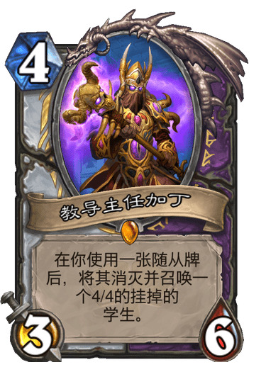 教导主任加丁的效果里是有强制死亡的,所以它和之前巨型鹦鹉不能触发,被惊奇卡牌消灭的随从亡语bug一样,但目前还不知道他们具体是怎么出问题的