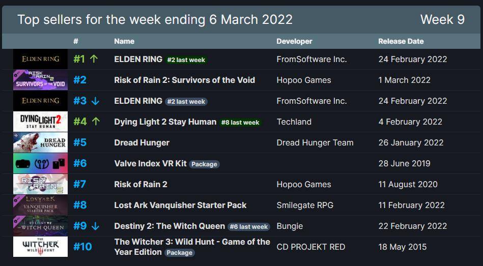 Steam公开新一周销量榜(2月28日至3月6日),《艾尔登法环》依旧畅销,夺得榜首,《雨中冒险2:虚空幸存者》第二,《消逝的光芒2》第四。