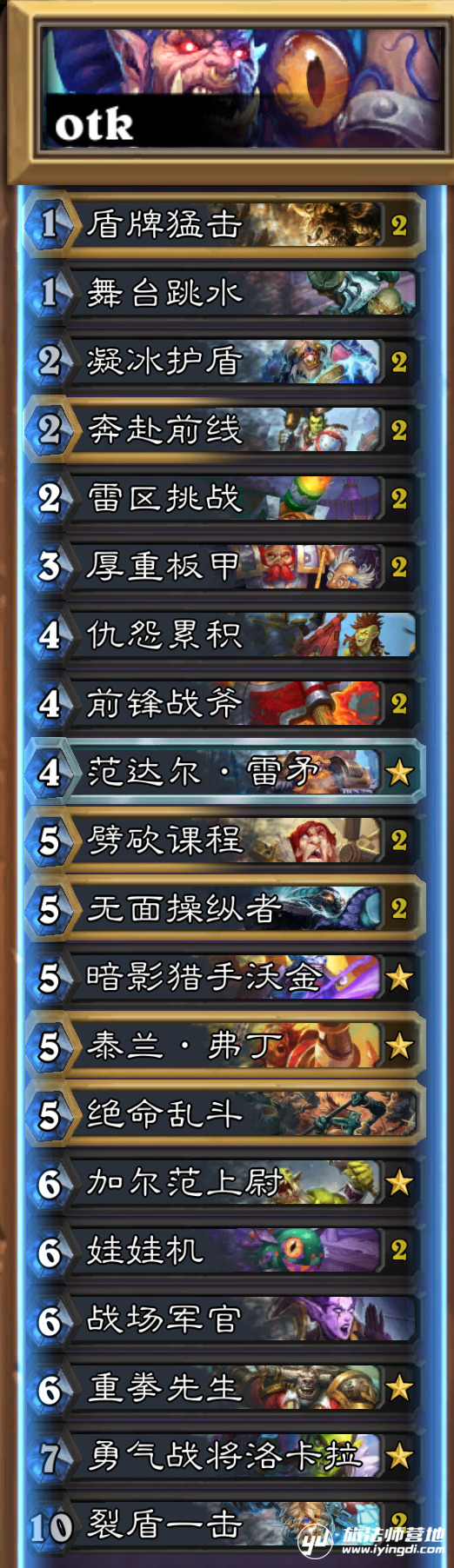 作为一个特别心水战士的玩家,回归不久就被上尉燃爆的台词——“击溃敌方阵型!”——所吸引,开始玩冲锋战。碰巧刚回坑就获得了我的第一张钻石卡范达尔雷矛,所以当然是选择用起来。因为afk导致缺失了大量卡,又不想合即将退环境的卡,所以我的牌表和主流可能有区别,目前为止每个月都是用这套牌在传说守门。