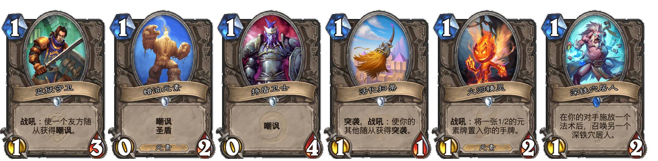 各有优缺点,监狱守卫即可配合鼓舞,113站场,持盾和蜡油前期保证不触发圣骑士的复仇武备,安全站场(说到圣骑士,战斗号角好离谱呀,拉出个尼鲁布,人直接没了)。活化扫帚返场用(功能牌),当然你也可以作为一费曲线裸丢(裸丢影响真不大),有鼓舞就能抽一张牌,火羽提供频率,深铁穴居人可裸丢,但最好2-3费手上有发现牌配合,2-3或3-4这样的身材站场。