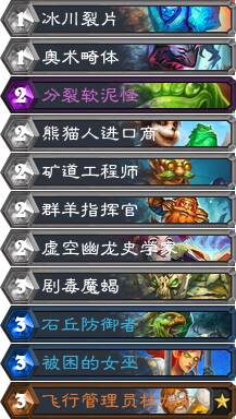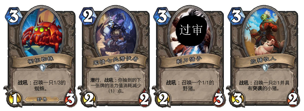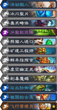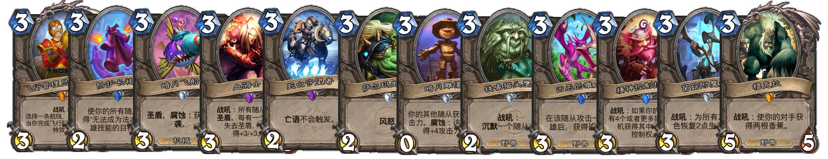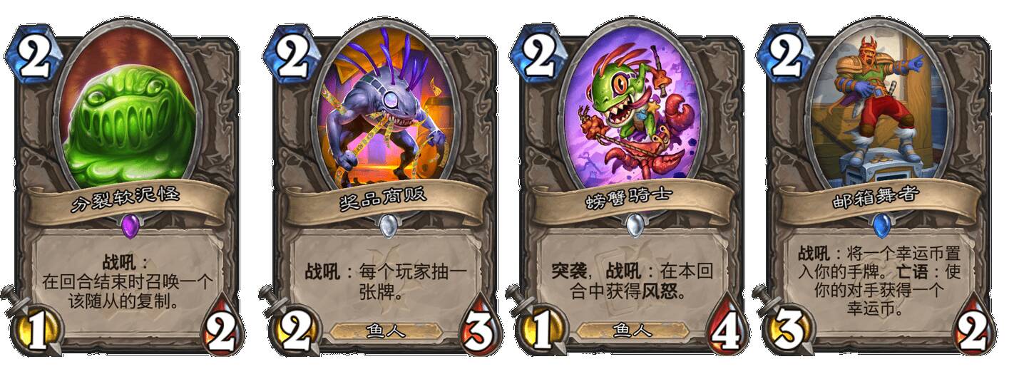 有何不可(费用高不选,里面有海盗帕奇斯可选),地底走卒。制造麻烦,奇袭部队(狂暴邪翼蝠和分裂软泥怪),战吼连击(费用高不选,尽量往低选)