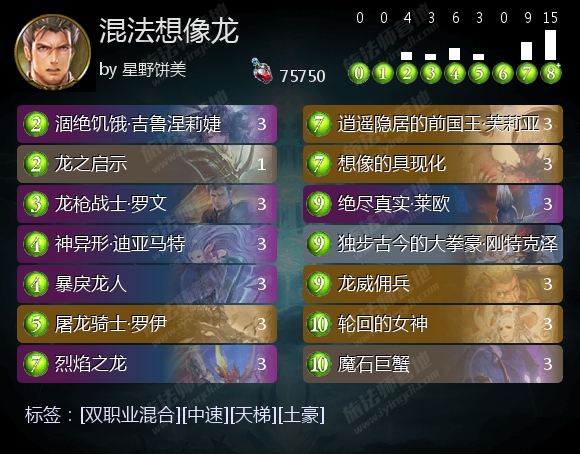 混法想象龙是围绕跳费体系运作的中速思路,依靠快速跳费后拍出各种强力高费牌取胜。在打出上限时,这套牌有能力在第5回合便建立对手无法处理的场面,直接劝退对手;更多情况下,这套牌则会在中后期通过各种空场输出手段配合场攻取胜。