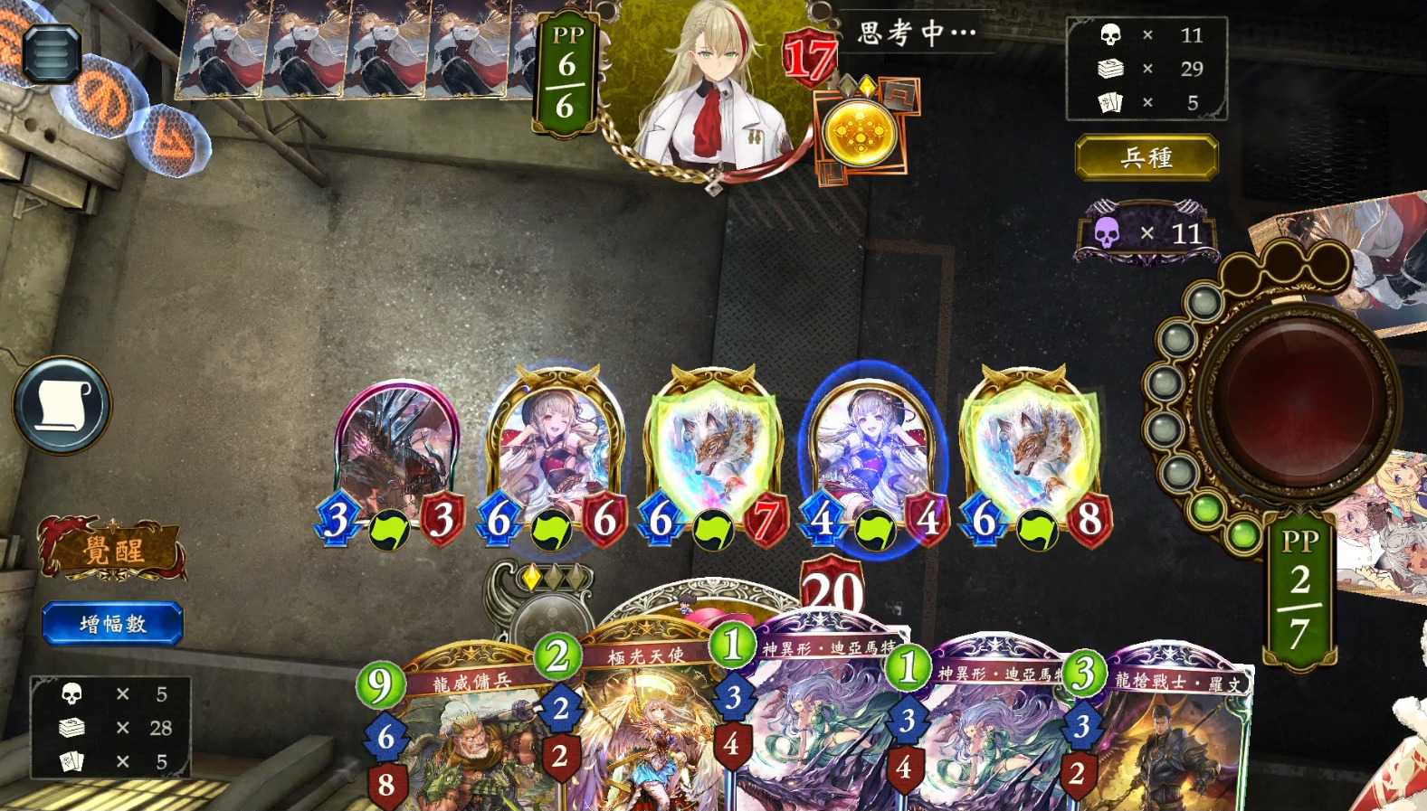 7费后优先使用想像的具现化,也可以进化逍遥隐居的前国王·芙莉亚。如果场面压力小,可以使用暴戾龙人和爆能龙枪战士·罗文的组合,或继续跳费。