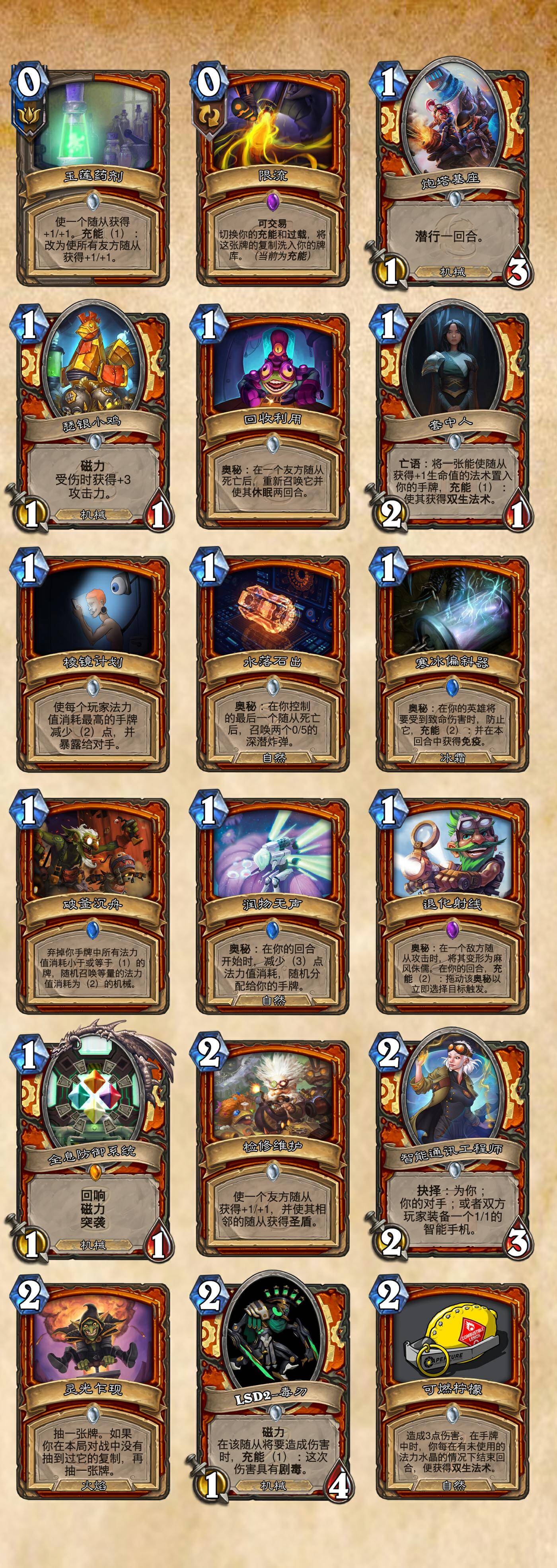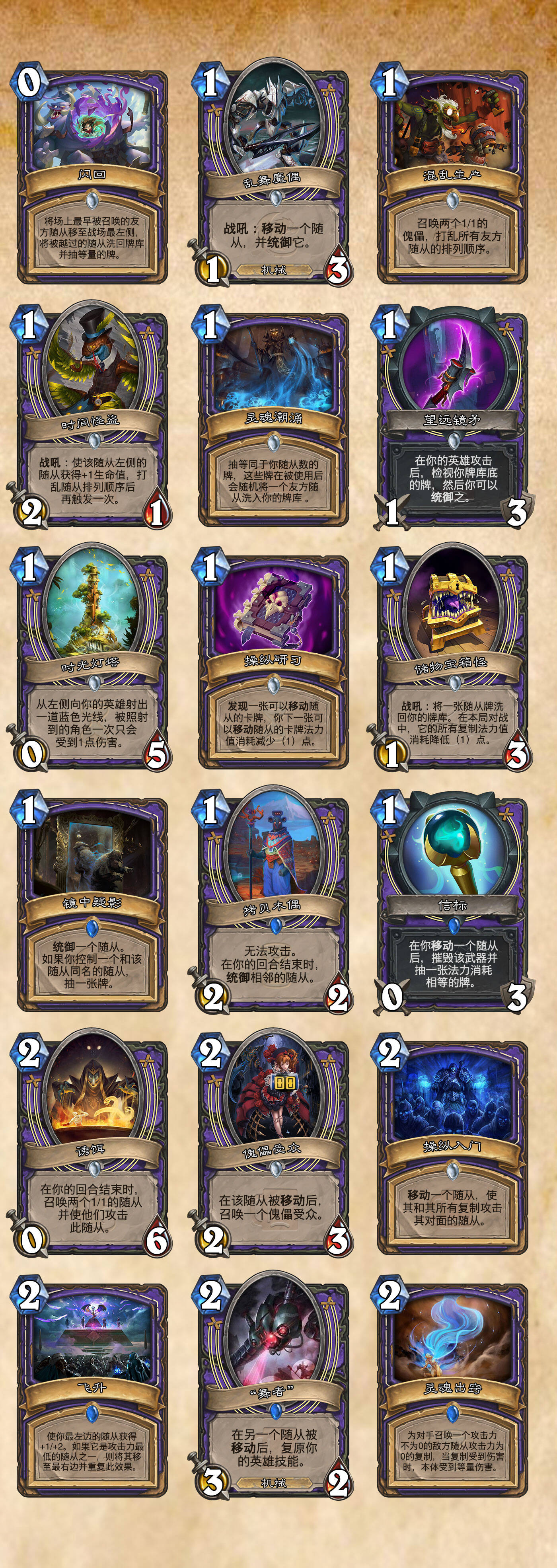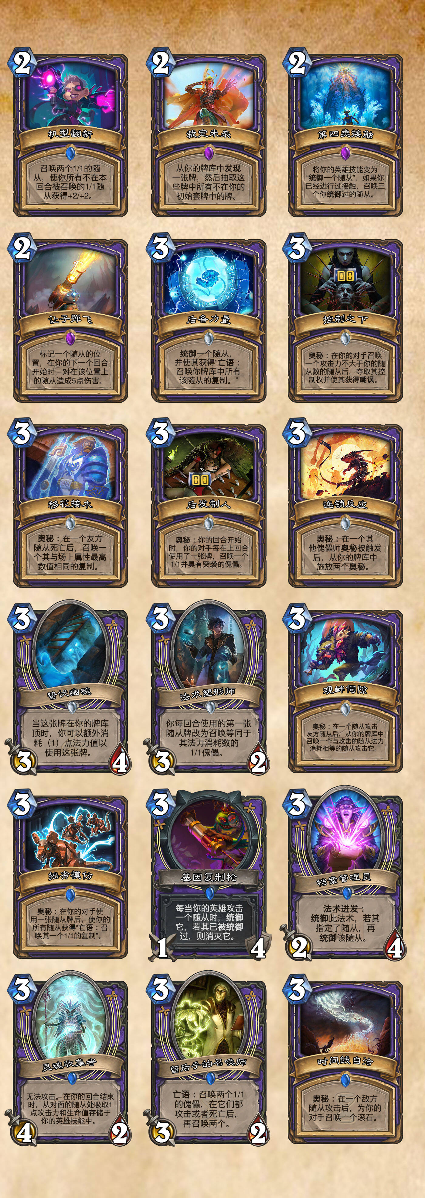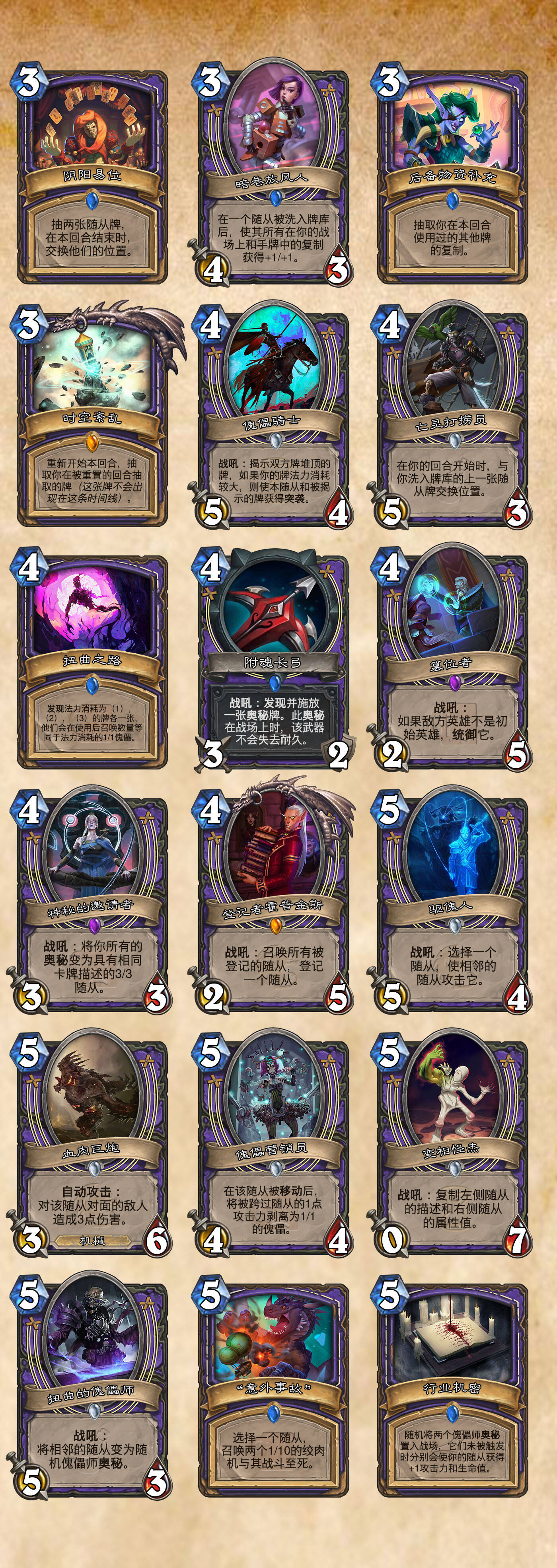 【特色】战场站位控制,大量复制随从与相关收益,摸牌相关花活,自动攻击,奥秘。