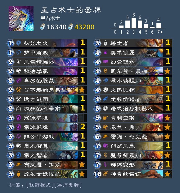 与环境中较轻的机克术类似,没有携带双吸取灵魂与血岩碎片刺背野猪人而是将重心放在过牌上,冒险模式有些敌人的牌过于离谱,吸那么点血也不是长久的办法。思路便是过牌,解场,算好亵渎既是,与再天梯里玩机克术变化不大,只是有一些特殊的牌需要防。这个在下面会讲到。由于冒险模式固定己方先手,一般留牌狗头人图书管理员=赛车回火>巡游向导>符文密银杖=护甲商贩>其他。面对特殊英雄时的留牌我会在下方提到。一般对局可以在9-10费结束,最胡8费启动。我的构筑并不完美,欢迎各位讨论。