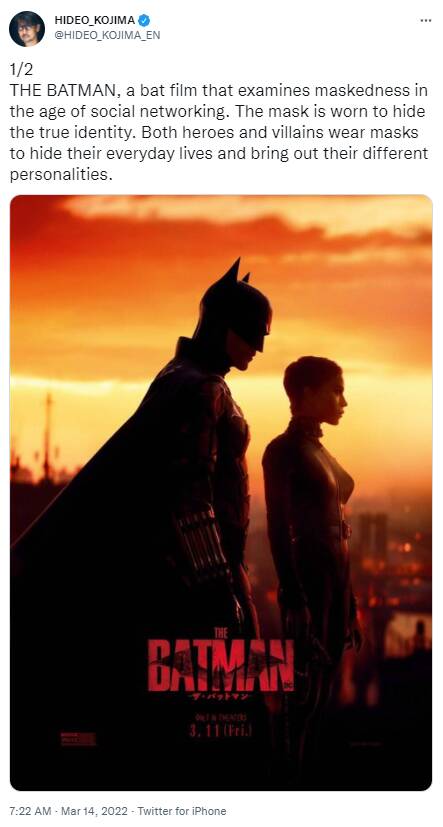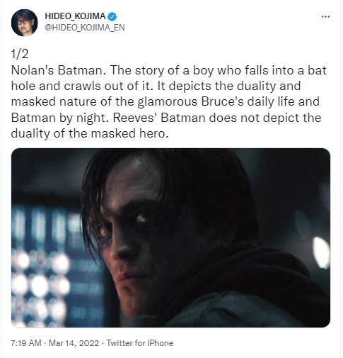 《新蝙蝠侠》已于3月11日在日本上映,著名游戏制作人小岛秀夫连发几条推文点评该片。