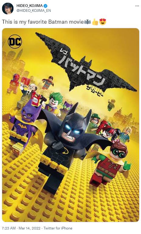 最后,小岛晒出了自己最喜欢的蝙蝠侠影片《乐高蝙蝠侠大电影》,颇具几分讽刺意味。他还解释了缘由:在超级英雄电影里,只有塑造出一个邪恶但又充满吸引力的反派才能维持平衡,单靠超级英雄的魅力是不够的,而《乐高蝙蝠侠大电影》在这方面堪称杰作。