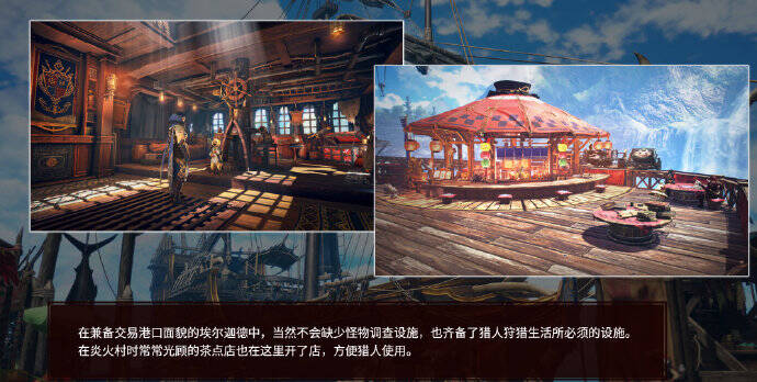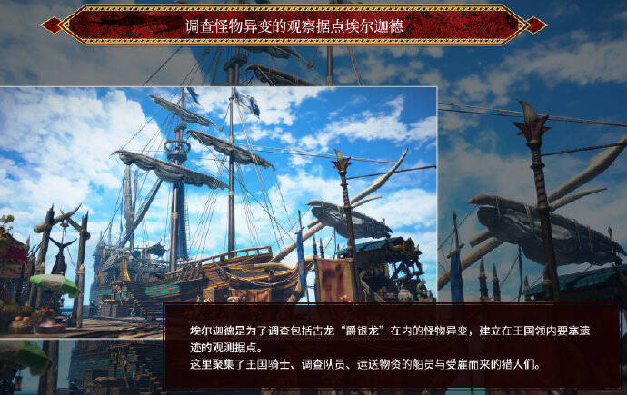 - 新据点:埃尔迦德是为了调查包括古龙“爵银龙”在内的怪物异变,建立在王国领内要塞遗迹的观测据点。这里聚集了王国骑士、调查队员、运送物资的船员与受雇而来的猎人们。