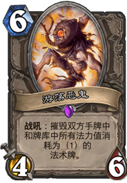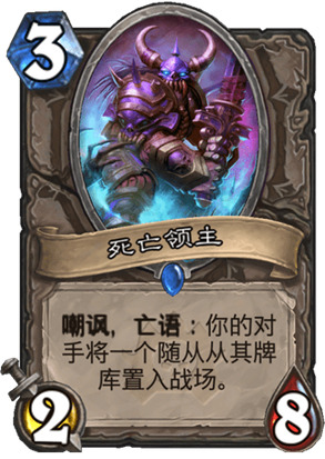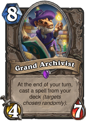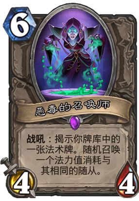 18年的狗头人与地下世界扩展包带来两张紫卡,它们的出现让高费法术提供的收益提高了一个档次,两位“卧龙凤雏”一位是喜欢不带箭头法术的狗头人档案管理员(这职业!),另一位则是铸就恶毒卡组的恶毒的召唤师。