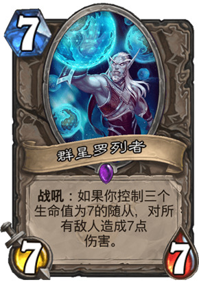 当“苟男女”打出后,既复原十费,又手中强力随从变为一费,简直是能玩出108种花儿来,当时小德的各种黑科技卡组也如同雨后春笋一般,而这当中捅起来的特别猛竟然是以张紫卡为核心的一套牌——77德。77德的7来自于“星星排列好了”,对于这种“触发血赚的中立紫卡”大家都是调侃后一笑而过的,没想到后来天梯上将充满它华丽的特效。