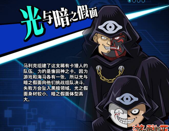 光与暗之假面是游戏王DM中的角色,属于马利克的古鲁斯集团。原作中仅登场一次,向游戏和海马发起自爆式组队挑战。使用假面魔兽和各种假面卡。