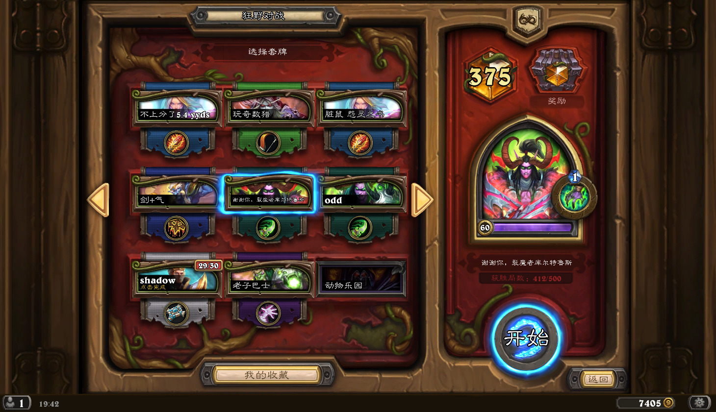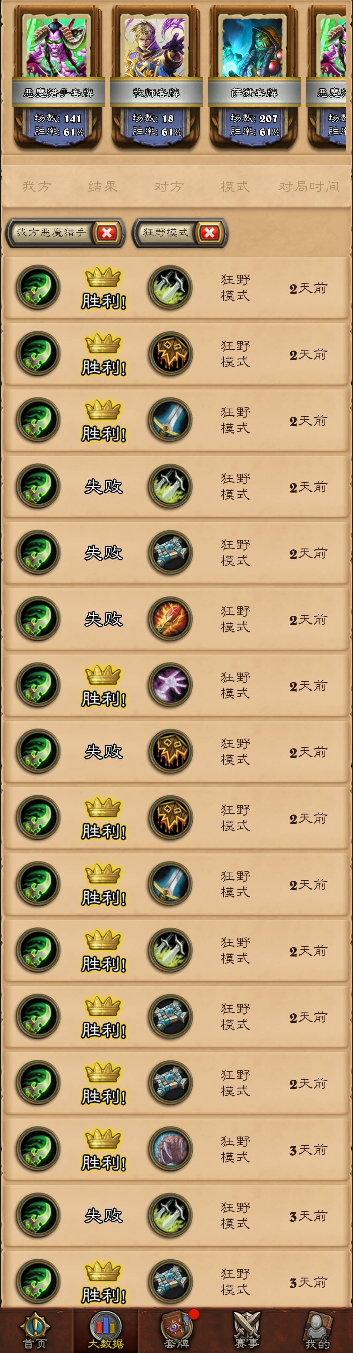 众所周知,狂野的恶魔猎手在经历了外域版本短暂的辉煌后,可以说是一蹶不振,形态和胜率都被压缩到极致,几乎只剩下奇数瞎一种形态。因为我今年一直在玩瞎子,所以看到这套不是奇数瞎的狂野瞎子,就迫不及待地尝试了一下(其实主要是因为这些卡我都有),实战了一百多把发现手感出乎意料地好。在拿这套卡组上传说以后,我又全程用它冲到了前五百。