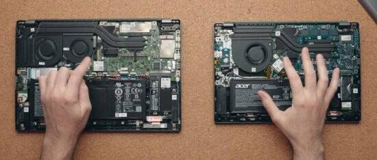 图中右侧是新款Swift X14,显卡是RTX 3050 Ti,没有独立风扇,热管也更细一些。