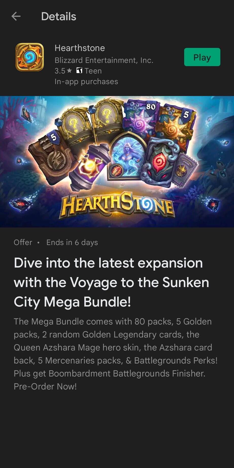 炉石的谷歌商城页面里显示了新版本的英文名“Voyage to the Sunken City(沉没之城的旅程)”,图中的豪华预购包括5金包,80普包,2张随机金橙,法师皮肤“Queen Azshara(艾萨拉女王)”及卡背,战棋礼遇,战棋终结特效“BoomBardment(砰砰轰击)”,和5佣兵包。