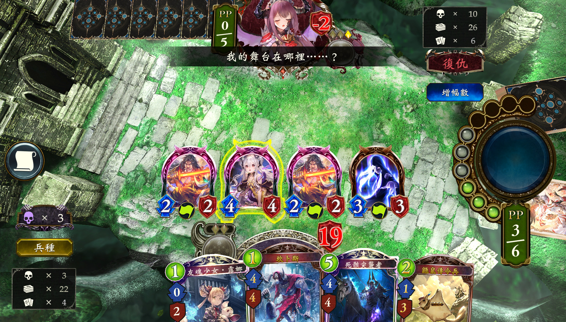 第1回合优先使用妖惑的药师·宵或友魂少女·露娜。如果第2回合无事可做,只能使用灵魂向导,露娜优先;其他情况下,宵优先。急需解场的话(例如对手场上有森林游侠·维尔达),可以使用入侵。