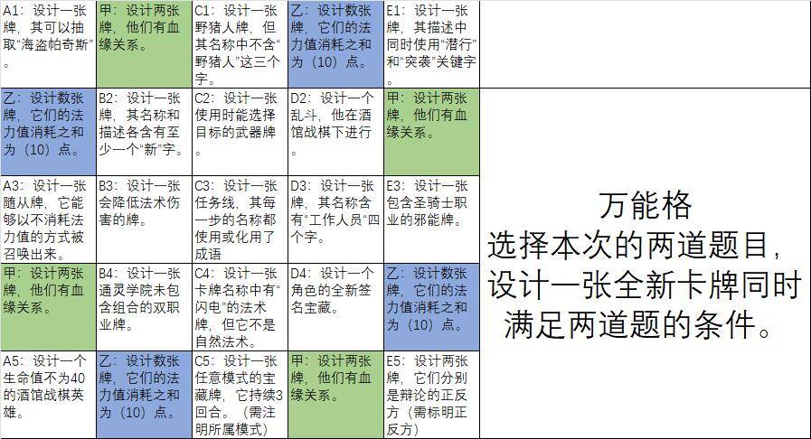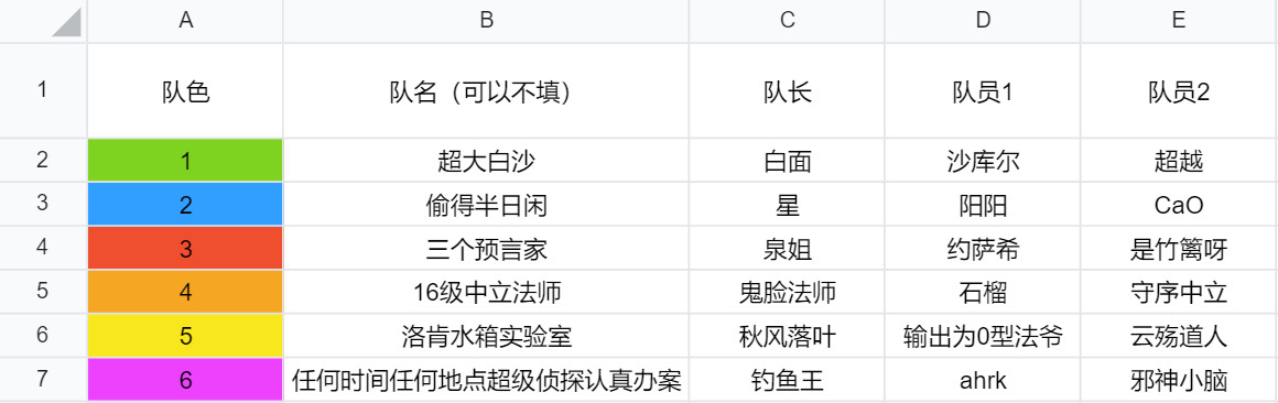 我们在qq群开展了做卡宾果乐的活动,规则如下:我们发布一张5*5的地图,玩家分成6个队伍,可以往相应的格子中投入符合题目条件的投稿,评委在其中选出得分最高的一个投稿,投出该稿的队伍就占领了那个格子。最终占领的格子排成1列,1排或者1斜线的队伍获胜。本次有一个队伍完成bingo!