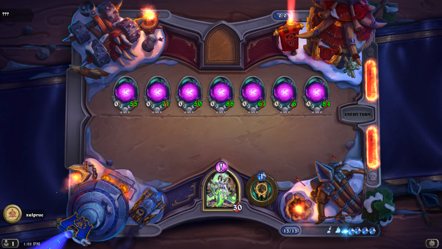 库尔特鲁斯关给出的是7个生命值每回合(大多)都会变化的随从,同时英雄有一个可以点随从的技能和15点费用,每回合可以花1费点一次。每过一回合就有可能有随从死,死了就失败,总共需要活过20回合。这一关也是每次数字都不相同,不能直接抄答案。