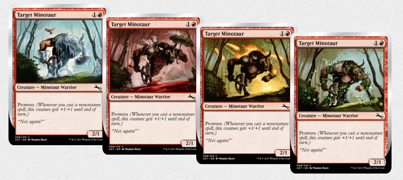 Target Minotaur 是另一张有异画版本的牌。这些牌是调侃牛头怪在那些会对生物做坏事牌的插画裡往往都是受害者。四张牌分别是牛头怪被不同的颜色攻击(冰 [蓝色]、酸雨 [黑色] 、火 [红色] 和藤蔓 [绿色])。