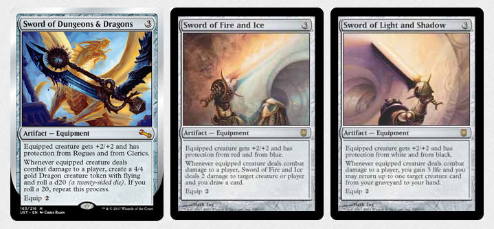 不管怎麽样,在设计 Unstable的时候,我想製作一张稍微愚蠢一点的Sword of _______ & _______ 讽刺这个剑循环应该会很有趣。设计团队提出了几个选项,但我们最喜欢的是 Sword of Dungeons & Dragons。这代表我们得和龙与地下城 团队讨论(过去曾未有过任何联名的产品),并问他们是否同意让我们製作这张牌。他们接纳了这个想法,但对要如何调整这张牌提出了一些建议。