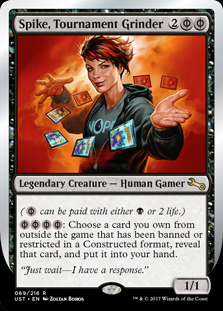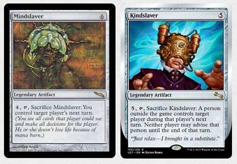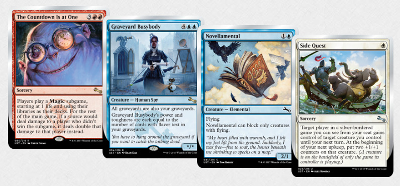 其中一个在 Un- 系列中我们很享受的部分,是引用系列裡的其他牌。Unstable 裡就有一些。The Countdown Is at One 引用了 Baron Von Count(他在设计时的名字是独白市长)和 Clock of DOOOOOOOOOOOOM!。Graveyard Busybody 上有 Spy Eye;Novellamental 把 Crow Storm 裡的乌鸦作为重点,而 Side Quest 则是把重点放在 Shellephant 裡的乌龟/大象。