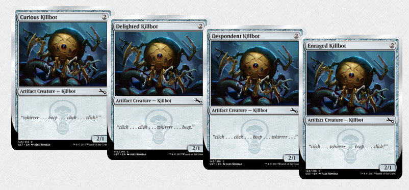我们希望套牌能使用很多杀戮机器人(Killbot)(有一副需要套牌裡放很多杀戮机器人的 Mary O'Kill 套牌),且这个系列裡有很多异体牌(插画、背景叙述、规则叙述、浮水印等),所我们想出了让一张牌有不同牌名的想法–我们刻意选择了同样的插画,因为觉得这样会更有趣。最后选择了情绪作为不同的牌名,因为插画相同的情况下能做漫画的处理方式。不过为了要有相同的收集编号,它们得要照字母顺序排列。我们选择把它们夹在 Contraption Cannon 和 Entirely Normal Armchair 中间,这就是为什麽都是 C、D 或 E 开头的原因。还有彼此的背景叙述也有些微的不同。