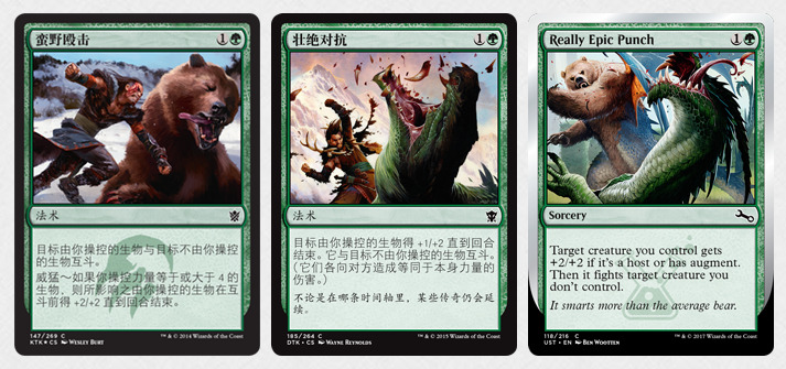 Really Epic Punch 是一个笑话的第三部分。这个笑话要从鞑契可汗裡的 蛮野殴击开始,展示了龙爪苏拉克正在殴打一隻熊。这张牌受到牌手的喜欢,所以在鞑契龙王裡我们製作了一张你能看到龙爪苏拉克正在殴打一隻龙的牌一壮绝对抗。当我们来到了 Unstable 时,我们发现我们漏掉了熊与龙之间的最终对决。大家讨论了许久究竟是让熊殴打龙还是龙殴打熊会比较有趣,最后我们决定熊殴打龙会比较好玩。