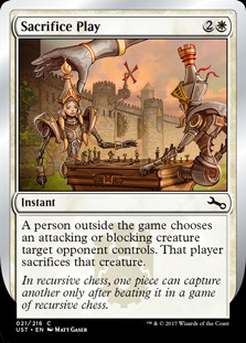 Unstable 裡使用了我们称为「外来协助」的内容,那些牌裡藉由让一个不在对局裡的人做出决定影响胜负来加入随机的元素。这个概念很难在插画裡呈现,但画家 Matt Gaser 在 Sacrifice Play 裡找到了一个很聪明的方式来呈现。你会发现左边要被拎走的那个牌手戴着像是主教的帽子,手裡看似也正要拿走在棋盘上的主教。