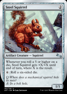 这个系列有一点松鼠主题,所以我们决定要把其中一张松鼠做成机械的神器生物。在开始这麽做之后,我们发现有个有趣的「Nut」笑话可以使用—钢铁松鼠会喜欢机械的 Nut(螺帽),而非食物的 Nut(坚果)。