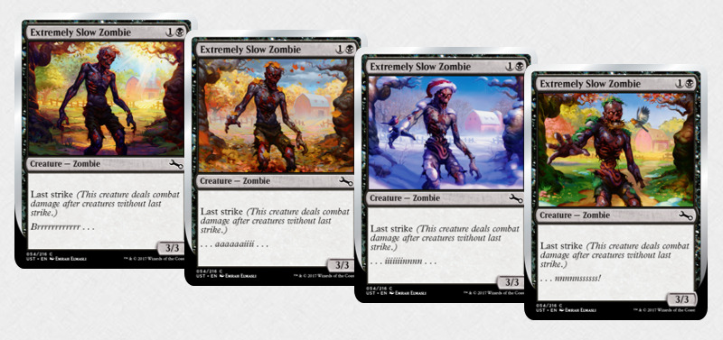 Extremely Slow Zombie 是其中一张有着多个异画版本的牌,四张牌连成了一个笑话。我们可以看到一隻灵俑缓慢地接近,但因为实在太慢所以季节已经提前变化。背景叙述上也利用了这个笑话,拼出「Brains(脑袋)!」。不过事后才发现,我们错过了让这几幕从冬天开始,如此一来「Brrrr」就会出现在冬天的牌上。