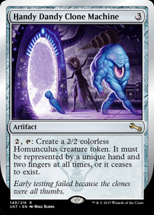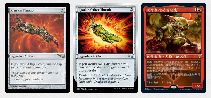 在秘罗地时,我想製作一张能帮助掷硬币套牌的神器。那最后在多张的情况下有些过强,所以对局设计师问我们是是否可以把它做成传奇。当然没问题。Krark's Thumb 最后在休閒牌手之间成了一张很受欢迎的牌,所以在製作 Unstable 时,我决定要製作同一张牌—不过这次是掷骰子。我一直开玩笑说喀勒克只有一个拇指实在有点怪,所以製作了 Krark's Other Thumb。在指挥官传奇裡我们终于把喀勒克做成传奇生物来完结这个笑话—当然他是没有拇指的。