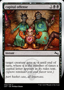 为了要利用惩罚大写字母的笑话,这张牌在标题栏、牌张类别栏或规则框裡都没有大写字母。我们也讨论了把收集资讯和版权文字也做成小写,但最后被告知我们不能这麽做。在插画裡,两个大隻被炸弹攻击的囉囉的衣服上也有着大写字母。这张牌本来是要被叫做惩罚大写(capital punishment),但这个牌名多年前已经在诡局:王权争霸裡被使用过了。