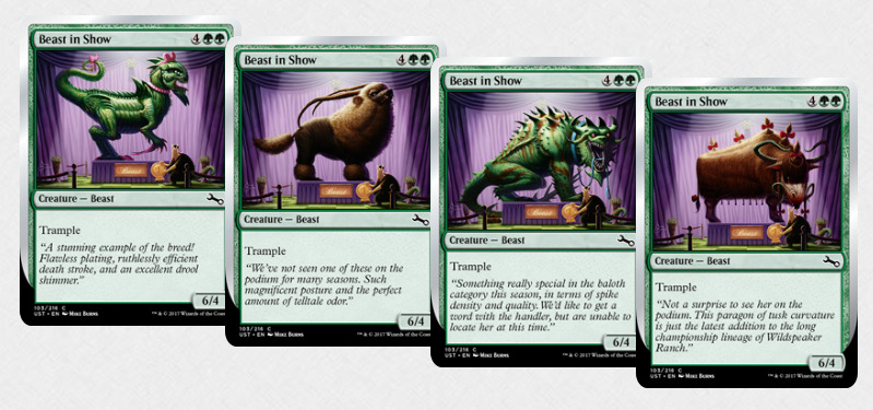 Beast in Show 是另一张有多幅插画的牌。这张牌的笑话在于要怎麽用野兽这个生物类别来包括如此大范围的生物。四张插画分别展示了巴洛西、糙节兽、犄牙兽和霸蛛龙。背景叙述很好玩地用了品种鑑定时的说法来分别谈论这些野兽。