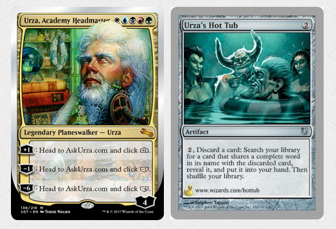 Urza, Academy Headmaster 延续了一个从 Unhinged 开始的笑话,而那是来自晴空号传说裡的一个事件。在故事裡,克撒的头被砍下,但依然活着。虽然在故事中他最后还是死了,Unhinged 探索了克撒依然以一颗头活下去的另一个结果。那出现在 Urza's Hot Tub 的插画裡。我们希望 Unstable 裡有一张鹏洛客,而牌手对克撒鹏洛客和五色鹏洛客的要求从未停过,所以我们寻找了能完成这些的机会且延续了没有身体克撒的笑话。