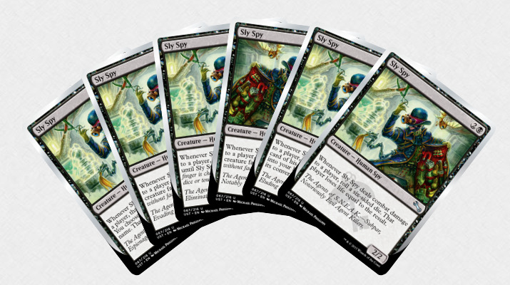 Sly Spy 有六个不同的版本,分别有一个不同的规则叙述。有个版本会消灭面向左边的生物,另一个版本会消灭面向右边的生物。我们把那张会消灭面向右边的插画做了镜像让他也面向右边,那是六张裡面唯一有着不同方向插画的。