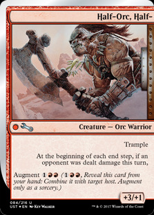 在命名增强牌上我们使用的一个协定,是它们的名字会是半—任何东西;半—(Half-Kitten, Half-;Half-Shark, Half-;和 Half-Squirrel, Half-)。为了利用这个笑话,我们製作了一张半—半兽人的牌,因为那是龙与地下城裡的一个生物。