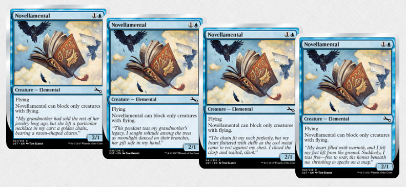 Novellamental 调侃了万智牌裡的元素被定义为可以是任何物质,这次则是短篇故事。这个名字来自所有异体牌都只有背景叙述不同,四张的背景叙述合在一起会变成一则短篇故事。另外,这本书的书名是简空(Jane Air)—开了小说简爱(Jane Eyre)的玩笑。如果再来一次,我希望我们可以有四幅不同插画,分别有一本不同书名的书。