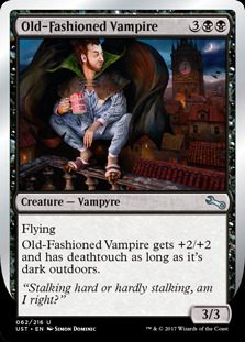 Old-Fashioned Vampire 有个令人难受的早晨—对他来说那是晚上八点(你可以看到背景裡有个时钟),因为对吸血鬼来说那是他的早晨。他喝血的杯子上写着「我不是个早起的人」。我们把他的生物类别做成吸血鬼(Vampyre)来利用他是个守旧吸血鬼的感觉。是的,从规则上来说,他也会被会对吸血鬼(Vampire)影响的东西所影响。