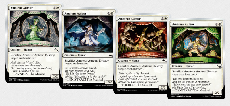 Amateur Auteur 调侃的是在万智牌设计中得设计每个时空上都可以运作的基本效应。这是一张我们持续製作的牌,有时在时空A、有时在时空B,有时又到时空C等。它一开始只是 {一}{白} 叫 2/2—一张我们做了很多次的牌,但我们得要加上结界去除因为它不适用于其他任何地方。这张牌用了异画来玩弄四个「不同时空」的笑话。同样的角色以同样的姿势出现在四个不同学院的音乐剧中(你可以从佈景中得知)代表了万智牌裡四个受欢迎的时空(依尼翠、拉尼卡、塞洛斯和贊迪卡)。我们接着在背景叙述是透过歌词来讲述每个时空的故事,再次强调了这齣戏是来自哪裡。