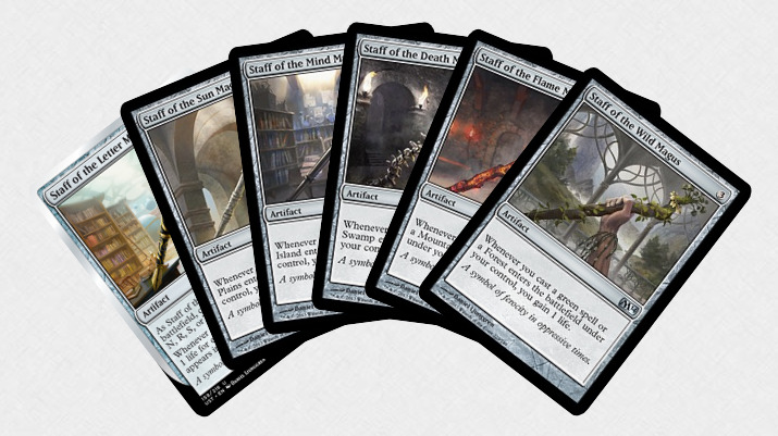 限量版(第一版)裡有一个被暱称为「幸运符」神器循环,你会在施放特定颜色的咒语时获得生命。这些神器在新手牌手之间十分受到欢迎,所以我们也持续製作新的版本。万智牌 2014 裡有一个除了该色咒语被施放外,在使用相应的基本地时也会获得生命的新版本。