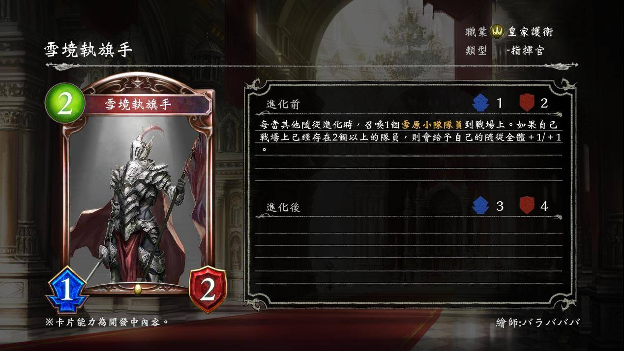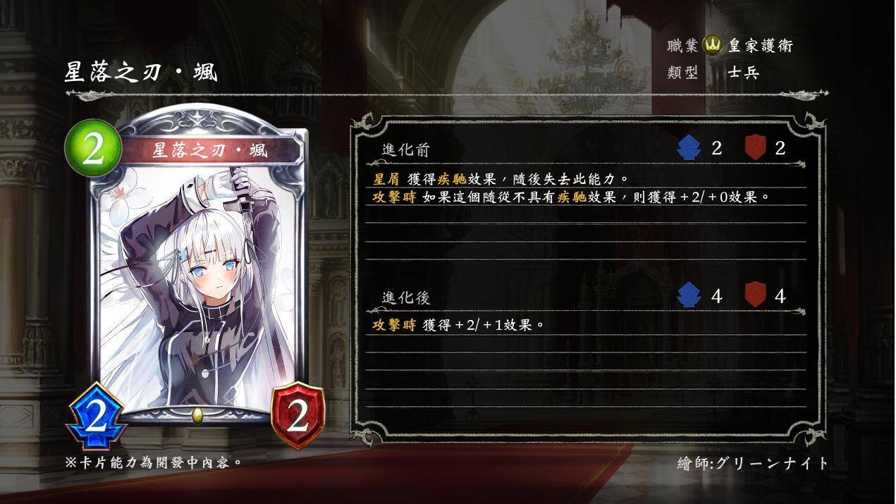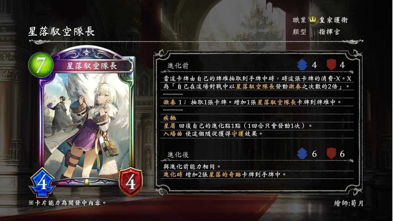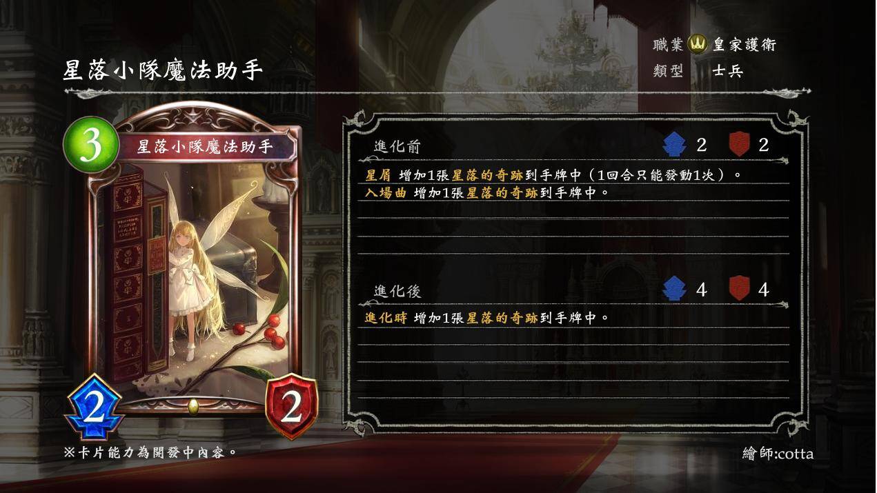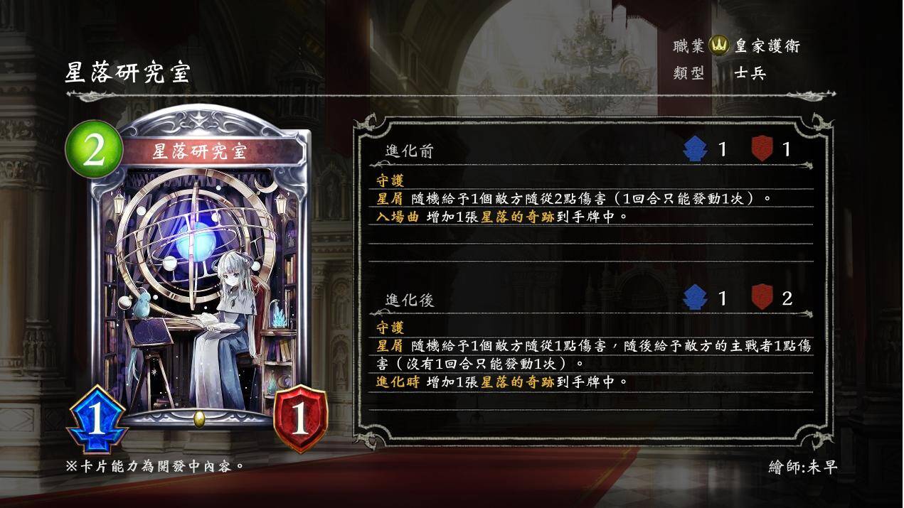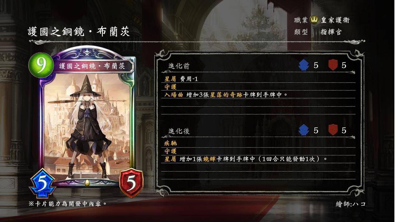 我在diy卡牌的时候有人跟我说这卡像法师而不像皇家,这个确实,就连这个 星屑 效果都类似于魔力增幅,但皇家确实需要全新的效果去为皇家打下良好的底子,不然一直是铺场抢脸刷进化,除非出那种特别超模的单卡,不然皇家几乎都不会在t1久呆,因为卡很容易被针对。(当然我这个关键词设计的并不是特别的好)尽管我认为原始的官兵配合是一个很好的正面收益,但是在现在这个环境中,手牌确实不太够用,场上也经常留不住人的情况完全不太适合官兵配合,收益不敢太超模。不过说了这么多,该坐牢还得坐。