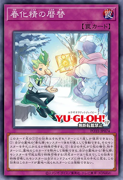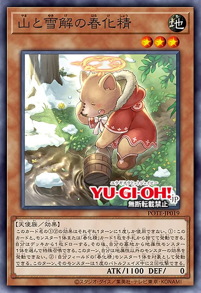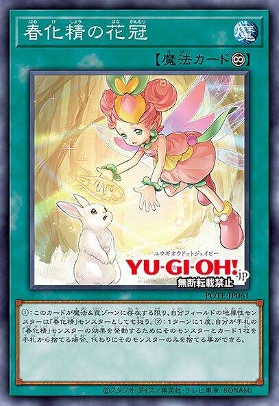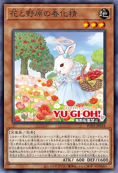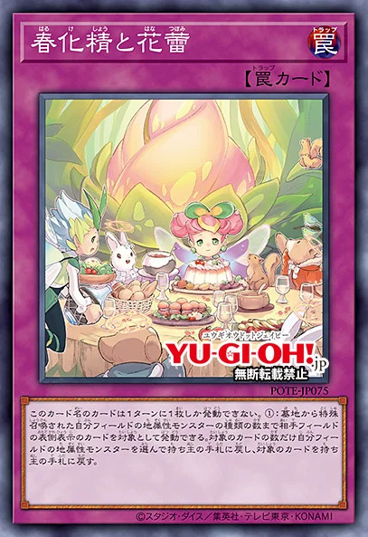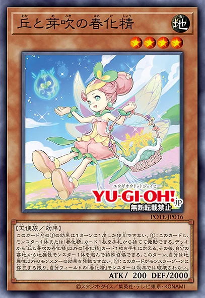 ①:将这张卡和1只怪兽或者1张「春化精」卡从手牌丢弃才能发动。从自己的墓地选「花和野原之春化精」以外的1只地属性怪兽加入手牌。那之后,可以从自己的墓地选1只地属性怪兽特殊召唤。这个回合,自己不能将地属性以外的怪兽的效果发动。