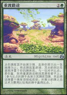 重渡路途能够排列牌库,使它在这套牌里扮演了重要的角色,足以稳定地获取胜利。实际上,重渡路途是喷火炮套牌能够如此稳定和优秀的重要原因,以前的喷火炮套牌经常会陷入稳定性问题。最常见的重渡路途排序如下(下图是从抓的第一张牌起, 为了比点你需要放一张无关的牌在第一张,然后比点比掉):