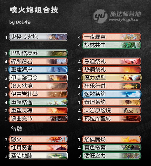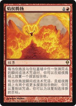 由于现在主牌并不需要焰侯腾扬,这张牌被我调整到备牌了。它仍然是对抗干扰的有力手段,因为你可以用重渡路途找到它和能帮助它启动的牌,在它启动后,循环使用巴勒格复苏、魔力塑型、尖岩原险境。