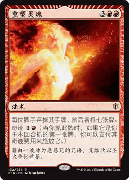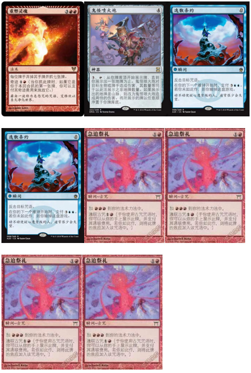 关键在于你先抓到重塑灵魂,以两点费奇迹施放,这会抓到一大堆祭礼、反击和一张鬼怪喷火炮,你可以按照需求调整,但是通常你需要一张鬼怪喷火炮和大量的爆费,也时常需要一些保护咒语。如果时间充足,你也可以稍微放缓速度并且把逸散条约放在第一张计划在一回合后施放重塑灵魂时手里有一张保护咒语。这套牌最重要的点就在于了解好的排列顺序,因为你需要经常根据对手的动作来调整(比如找到活旺之力或者怒火这类得仇恨单卡)。