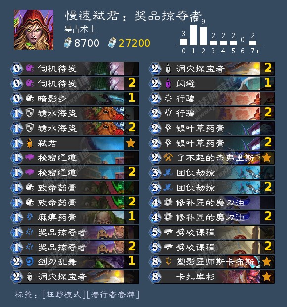 秘密通道,洞穴探宝者,行骗,银叶草药膏,团伙劫掠,劈砍课程多达9-12张过牌,过牌效率极高,很容易在10费前抽光牌库。